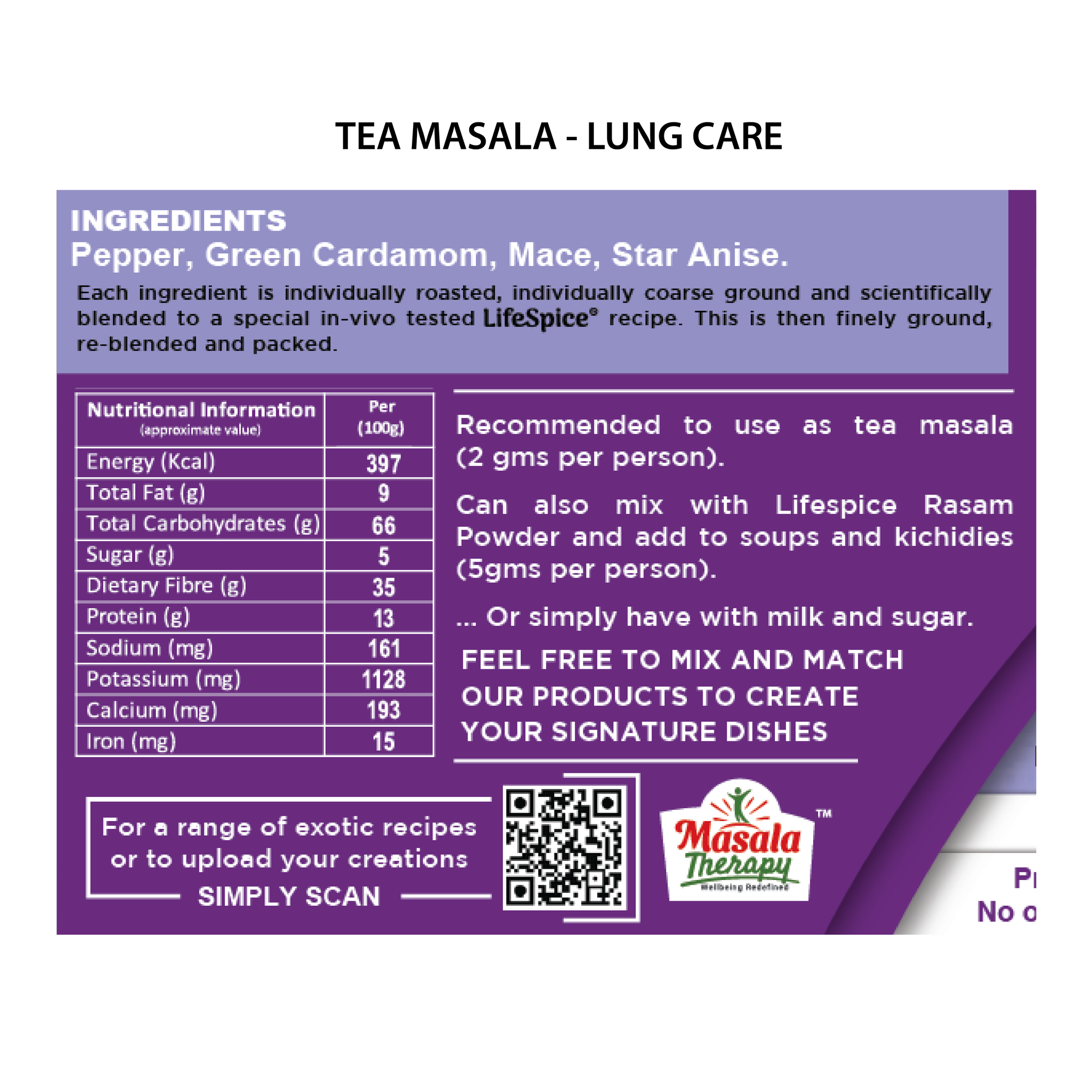 A Signature mix of original spices in a special formulation that has been tested in research labs - genes related to pulmonary and respiratory Health and neuroprotection upregulated with periodic use of Lifespice Lung Care Tea Masala. Can be used as regular Tea Masala. Can simply be sprinkled on Boiled / Fried eggs with some salt. Can be added to curries and Kurmas.